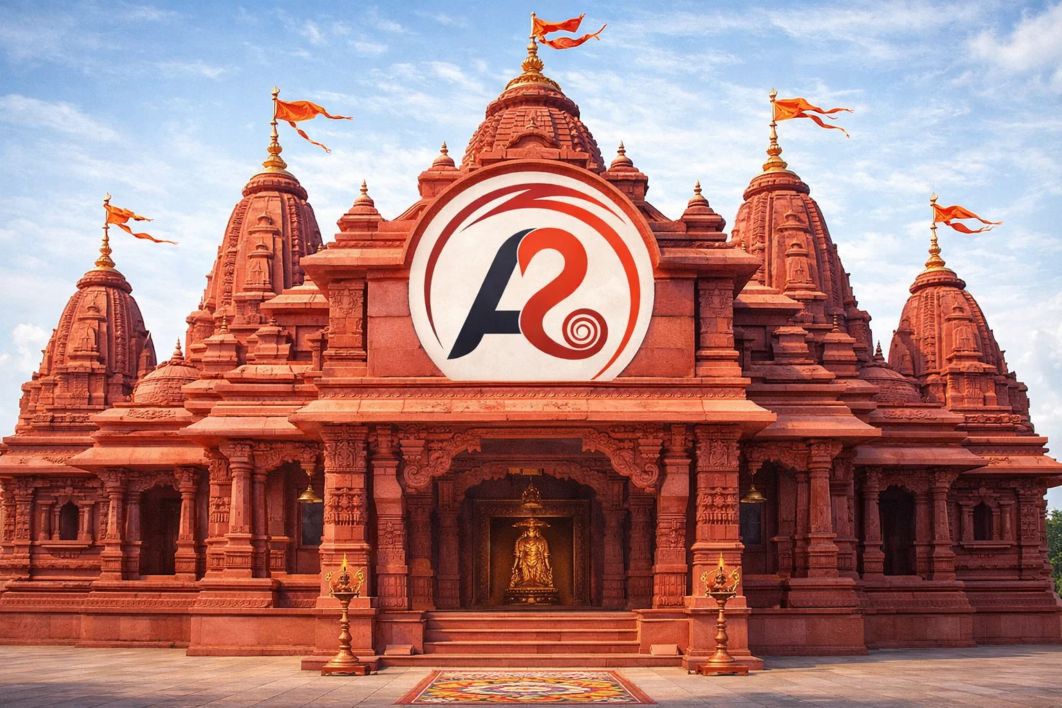 The dome or shikhar-style sandstone mandir is inspired by historic temple architecture. The curved dome structure at the top gives the temple a majestic and sacred appearance.
